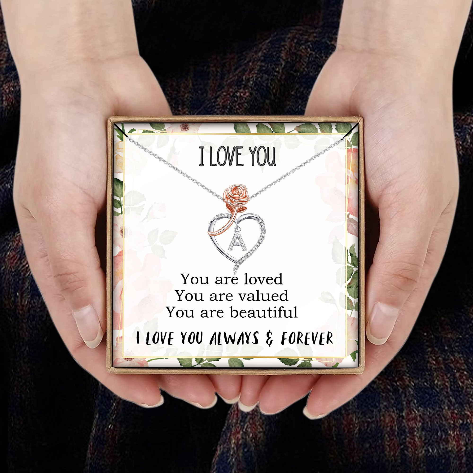 JSJOY Rose Heart Initial Necklaces Gifts for Women Teen Girls, Rose Love Heart Letter Pendant Necklace Jewelry Mothers Day Valentines Anniversary Birthday Gifts for Her Women Wife Girlfriend Mom