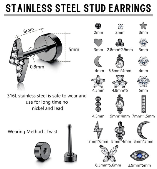 JSJOY 20Pcs Stainless Steel Stud Earrings for Women Men 20G Tiny Cartilage Stud Earrings Small Snake Star Moon Ball Butterfly Heart Eye Flower Screwback Flat Back Stud Earrings Piercing Jewelry Set